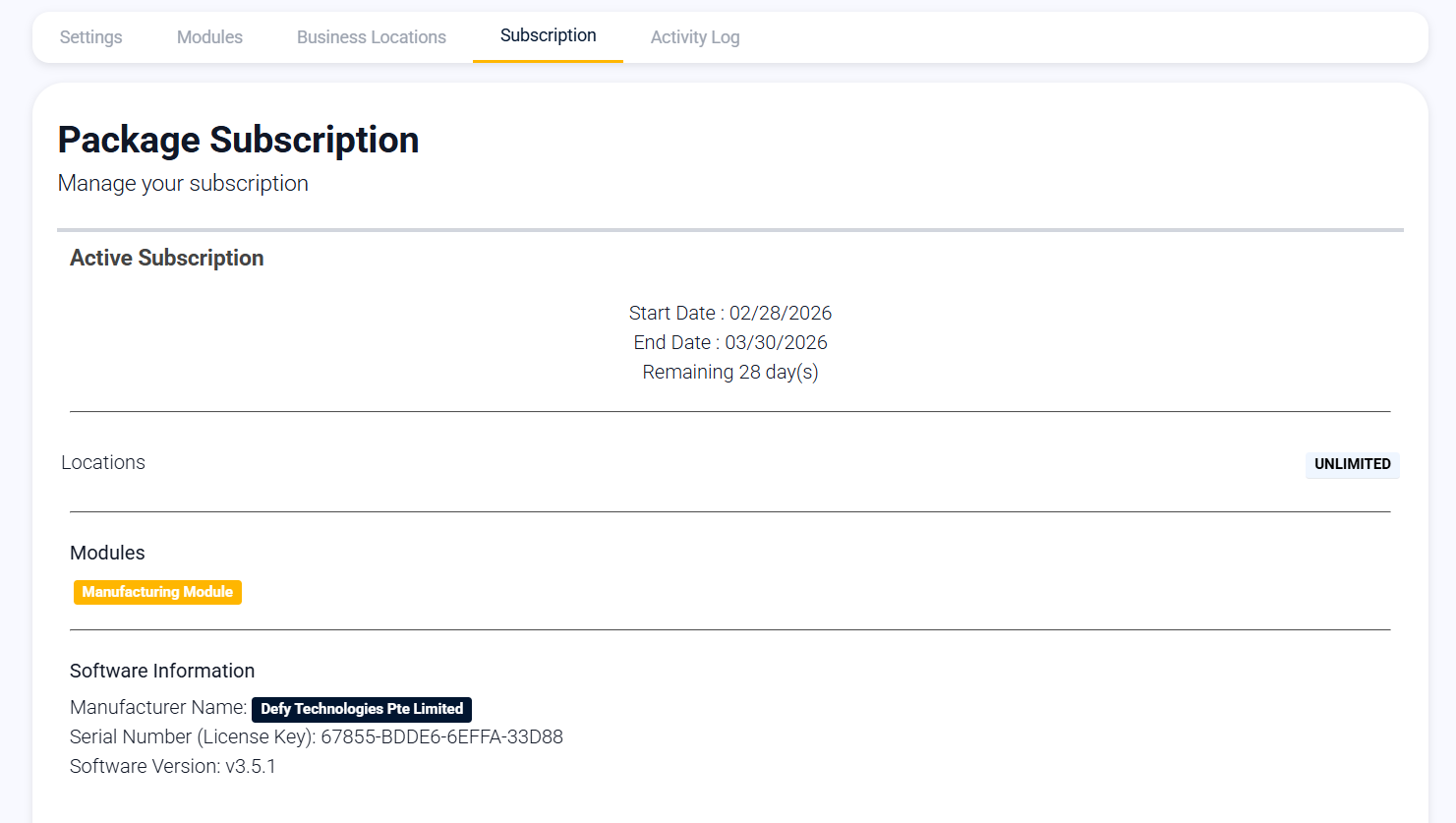 • Go to Settings → Subscription to view your subscription info, including Manufacturer, Serial Number, and Software Version.