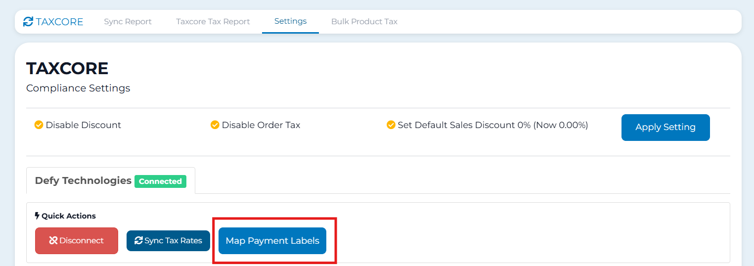 taxcore/settings(Taxcore->Settings). - Click on Map Payment Labels.