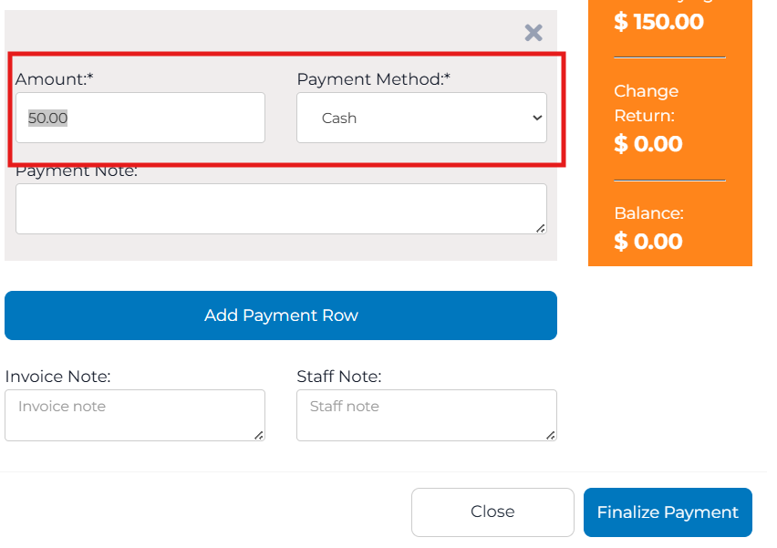- Add Payment Row: Click Add Payment Row to include another payment method.
