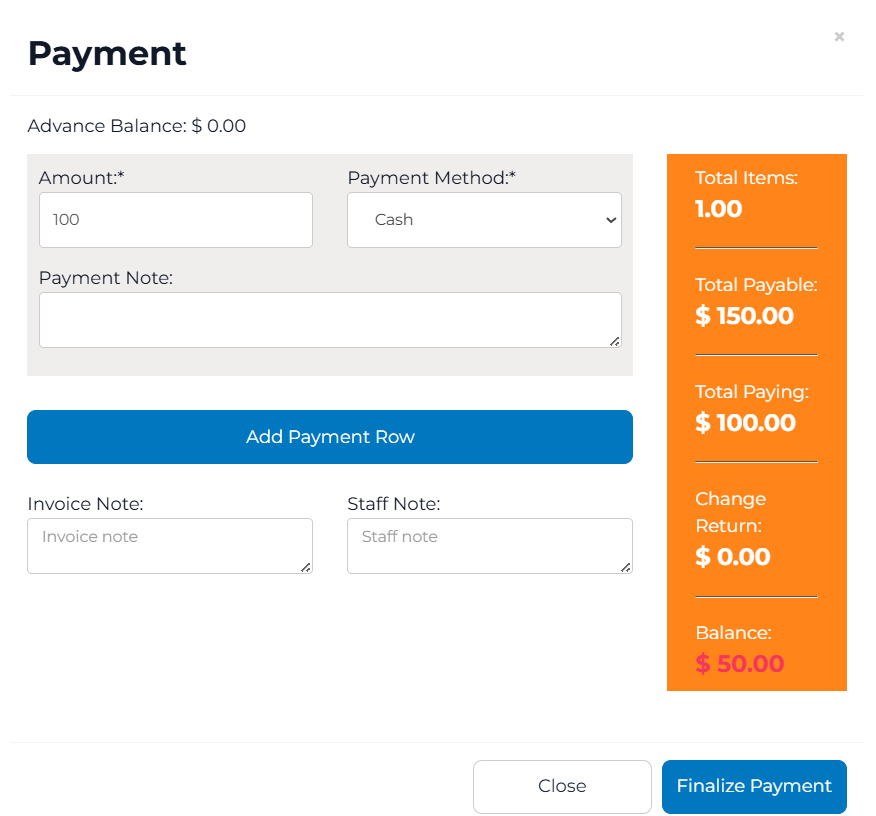 - Select Payment Method: Choose the payment method for the new row and enter the amount.